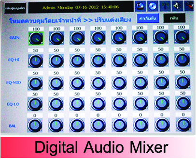 - มี Digital Audio Mixer 8 Channels มีฟังก์ชั่น Gain , Equaliazer , Hi-Mid-Low , Balance Digital Fader รวมทั้งมี VU Meter แสดงในแต่ละอุปกรณ์ภายในตัวเครื่อง