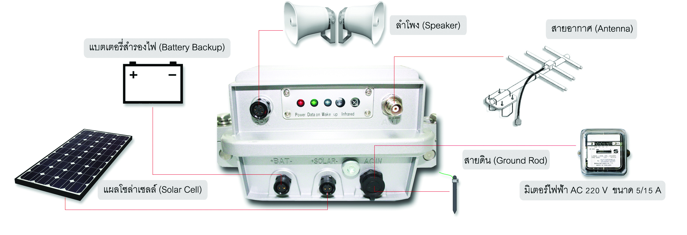 - สามารถใช้แหล่งจ่ายไฟ ได้ถึง 3 แหล่ง คือ จากแหล่งจ่ายไฟชนิด 220VAC , Battery 12V18A และ Solar Cell (อุปกรณ์เสริม)